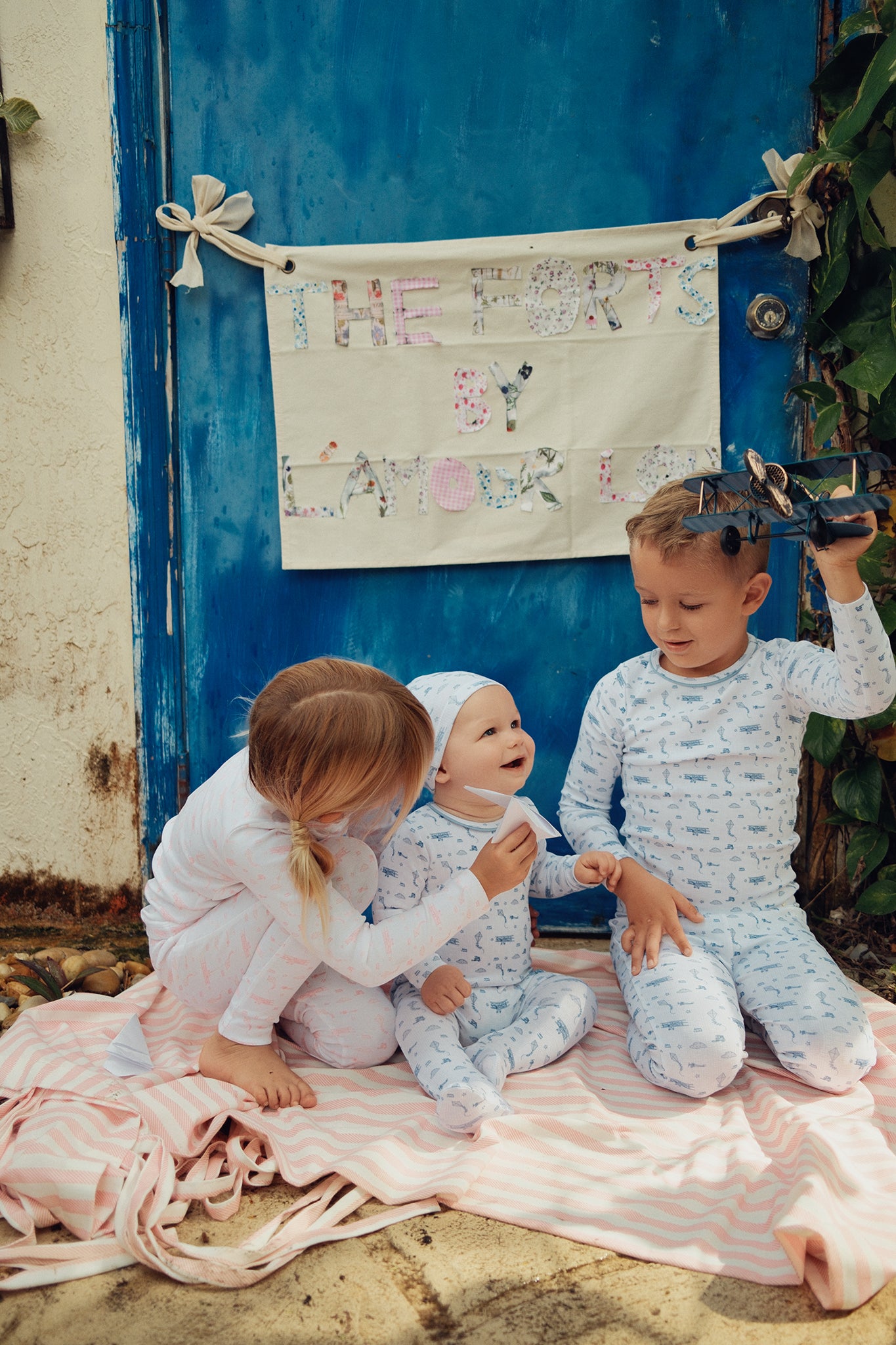A sky where little dreams take flight. Vintage planes drift between cotton clouds and gentle kites, creating a pajama set that feels like a quiet adventure — perfect for drifting off to places only imagination can reach.